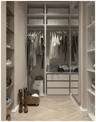 Stylish walk-in closet with neutral tones and contemporary design elements.