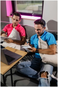 Two brothers studying online together, taking notes on a sofa.