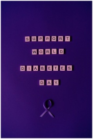 Creative display of scrabble tiles spelling Support World Diabetes Day and a purple ribbon on purple background.