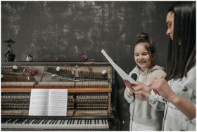 A young girl learning piano with a teacher in a co