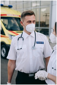 Paramedics wearing protective masks and gloves standing by an ambulance, ready to assist.