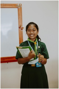 Cheerful student in uniform holding a notebook, standing in a classroom.