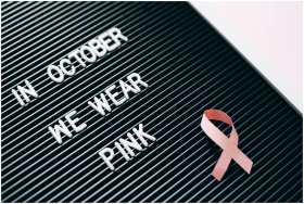 Letter board with 'In October We Wear Pink' message highlighting breast cancer awareness.