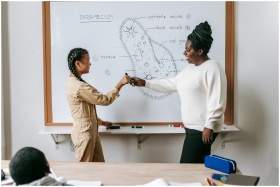 A teacher and student smiling and engaging in a classroom while discussing a paramecium diagram on the whiteboard.