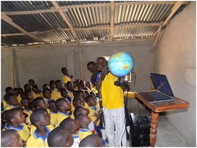 Teacher and students exploring geography with a gl