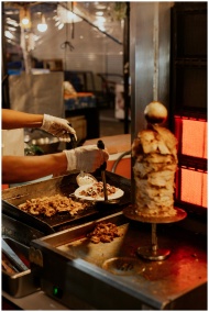 Chef prepares doner kebab with fresh ingredients at a food stall.