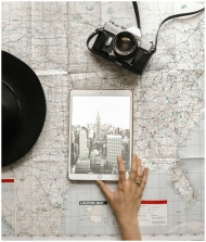 Flat lay of vintage camera, iPad with New York City skyline, and a hand on a map.