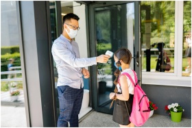 A teacher checks a student's temperature as she arrives at school, ensuring health safety during the pandemic.