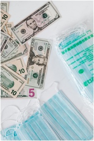 Top view composition of disposable medical masks placed on white table near scattered randomly various paper banknotes of American dollars
