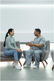 A doctor consults with a patient in a modern, well-lit clinic environment.