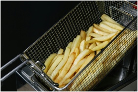Close-up of freshly fried crispy French fries in a