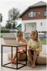 Two young girls learning online outdoors, sitting on poufs with laptops and notepads.