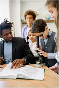 Students and teacher in a science class using a microscope for learning.