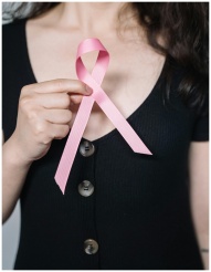 A woman holds a pink ribbon symbolizing breast can