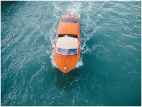 Overhead view of a classic wooden boat navigating the turquoise waters of Venice, Italy.