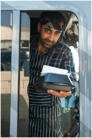 Male food vendor presenting a takeout box from a food truck window, wearing plaid shirt and apron.
