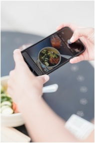 From above of crop unrecognizable blogger taking photo of vegetarian salad and smoothie on cellphone in street cafe