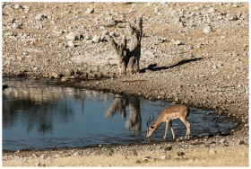 A solitary impala drinking at a waterhole amidst the arid savannah landscape in Namibia.