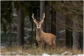 A deer with antlers stands proudly in a snowy fore