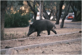 A wild boar strolling through an urban park in İzmir, Türkiye, providing a unique natural encounter.