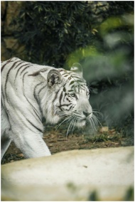 Striking white tiger captured in a serene natural setting, showcasing its unique beauty.