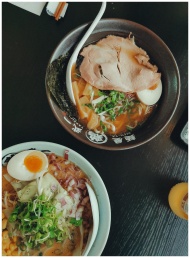 Top view of two ramen bowls with eggs, meat, and g