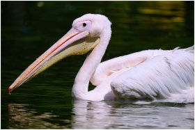 Close-up of a great white pelican gracefully gliding across a tranquil lake surface.