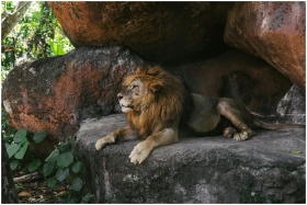 A majestic lion lies among rocks in Bali's lush ju