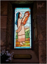 Stained glass window of Holy Mary holding a child at St Joseph Apache Mission, Mescalero, NM.