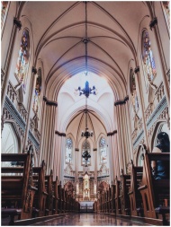 Captivating interior view of a Brazilian cathedral showcasing intricate architecture and stained glass artistry.