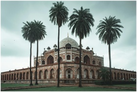 Low angle of beautiful well maintained garden with palms and ancient building of Humayun s Tomb located in Delhi