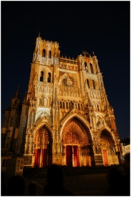 Stunning nighttime view of the illuminated Notre-Dame d'Amiens Cathedral in France.