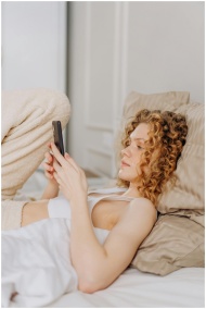 Young woman with curly hair lying in bed, using smartphone, enjoying leisure time indoors.