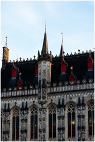 Gothic-style building with ornate details and spires in Brujas, Belgium.