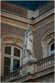 Elegant stone statue on a historic French building facade with intricate architectural details.