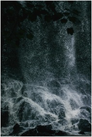Dramatic waterfall cascading over rocks in Lankaran, Azerbaijan, with a dark and moody atmosphere.