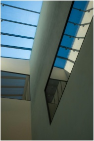 Low angle view of a modern building interior featuring a glass ceiling and geometric architectural design.