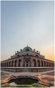 Historic Humayun's Tomb in New Delhi captured at sunset highlighting its architectural beauty.
