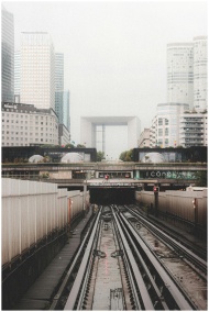 Railway leading into an urban cityscape with skyscrapers and modern architecture in a cloudy setting.