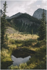 Beautiful mountain landscape featuring a tranquil pond and lush greenery under a cloudy sky.