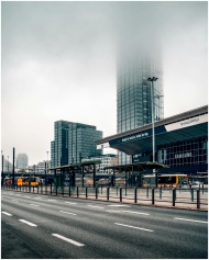 A cloudy view of Warsaw's skyscrapers capturing urban life and modern architecture.