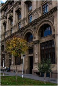 Detailed view of a historic building's facade in İstanbul with autumn trees.