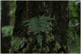 A vivid close-up of a lush fern growing on a moss-covered tree trunk in a Madagaskar forest.