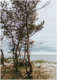 Windswept pine trees by the Baltic Sea on a serene, cloudy day in Palanga, Lithuania.