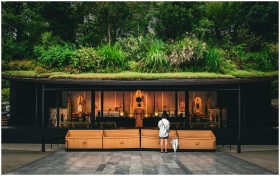 A visitor stands before a shrine at Dazaifu, Fukuoka, surrounded by lush greenery and traditional architecture.