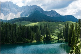Breathtaking landscape of Lago di Carezza with lush forests and Dolomites in Italy.
