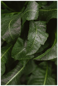 Detailed view of fresh green horseradish leaves with dew droplets.