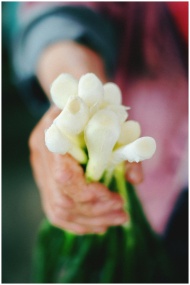 Close-up of a hand holding bunch of fresh spring onions with blurred background.