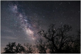 A breathtaking view of the Milky Way with silhouetted trees in Hamedan, Iran.