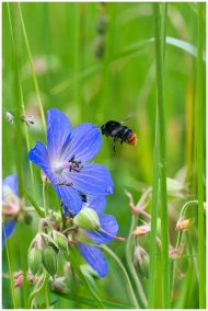A close-up of a bee pollinating a blue wildflower